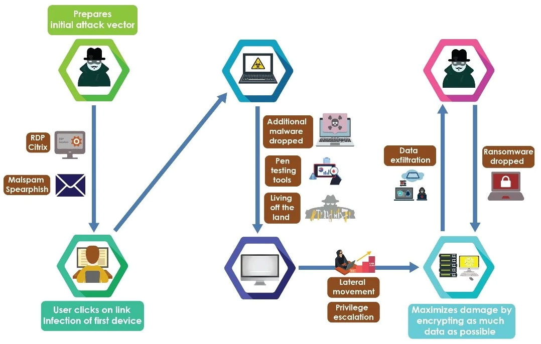 Unauthorized data exfiltration can be accomplished in a number of ways. For example, a threat actor could gain access to a compromised corporate email account to send and receive files outside of the network–the credentials for this access having been obtained during the initial ransomware attack. Then, they could use malware, open-source penetration testing tools, or other well-known techniques to move freely through the organization’s network. This access allows them to target the critical data they need to run their data extortion campaigns. Below is a typical infection process, as outlined by cisecurity.org.