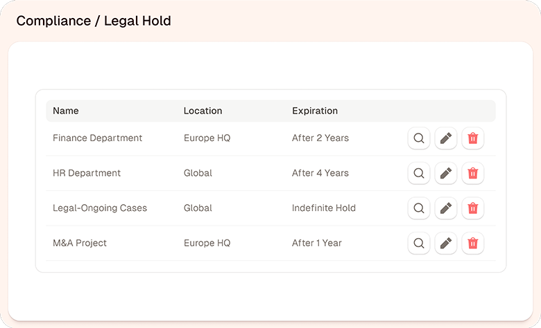 Custom retention rules, legal hold capabilities and full audit trails ensure compliance with GDPR, HIPAA, CCPA, SOX, and more.